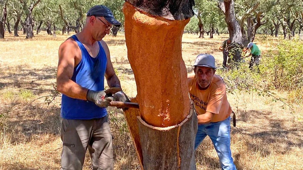 First they cut deep into the bark, then twist their axes and use the handles to prise long cork planks from the ancient oak trees that cover Portugal's biggest province, Alentejo.